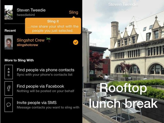Το Slingshot είναι η τελευταία προσπάθεια του Facebook να ανταγωνιστεί το Snapchat. Διατίθεται δωρεάν σε συσκευές iOS και Android και προκειμένου ο χρήστης να μπορέσει να δει μήνυμα βίντεο ή φωτογραφίας πρέπει πρώτα να απαντήσουν με ένα δικό τους μήνυμα. Ωστόσο, παρότι αυτό το send-one-to-see-one unlocking feature ενθαρρύνει μια πιο ισορροπημένη συνομιλία, την κάνει ταυτόχρονα και πιο αργή.