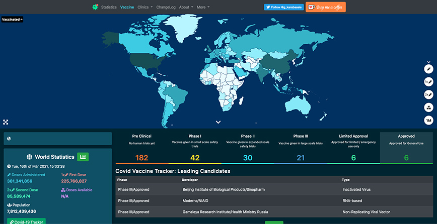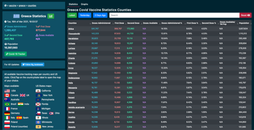 «Η ιστοσελίδα ncovtrack.com παρέχει τα καθημερινά στατιστικά στοιχεία του κορονοϊού σχετικά με τα κρούσματα, τους θανάτους, τις αναρρώσεις, τους διασωληνωμένους και τα τεστ ανά χώρα, περιοχή και περιφέρεια, για όσες χώρες τα στοιχεία αυτά είναι διαθέσιμα. Πρόσφατα πρόσθεσα και τον πίνακα ελέγχου για τα εμβόλια. Τα δεδομένα για τα εμβόλια ανανεώνονται ανά συνολικές δόσεις (που είναι στοιχεία διαθέσιμα για όλες τις χώρες) και για πρώτες και δεύτερες δόσεις, για όσες χώρες αυτά τα στοιχεία είναι διαθέσιμα» αναφέρει ο Γιώργος Καραμπάσης.
