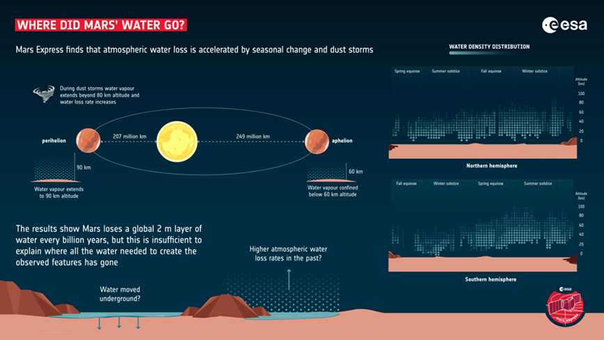 Όπως αναφέρει η σελίδα της υπηρεσίας, esa.int, η διαφυγή του νερού στο Διάστημα επιταχύνθηκε από καταιγίδες σκόνης και την εγγύτητα του πλανήτη προς τον Ήλιο, ενώ υπάρχουν ενδείξεις ότι ορισμένες ποσότητες νερού μπορεί να έχουν υποχωρήσει υπόγεια.