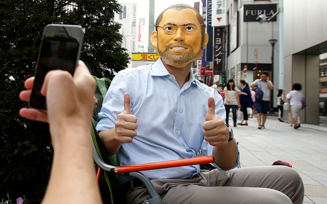 Η μπλούζα του άντρα γράφει «9 μέρες απομένουν για την κυκλοφορία του iPhone 6», ενώ δεν έλλειψαν και οι μάσκες του συνιδρυτή της Apple, Steve Jobs…
