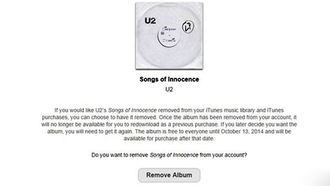 «Μερικοί πελάτες ζήτησαν τη δυνατότητα διαγραφής του “Songs of Innocence” από τη βιβλιοθήκη τους, έτσι δημιουργήσαμε το itunes.com/soi-remove ώστε να τους επιτρέψουμε να το κάνουν εύκολα. Όποιος πελάτης χρειάζεται επιπλέον βοήθεια, μπορεί να επικοινωνήσει με το AppleCare», δήλωσε εκπρόσωπος της εταιρείας στο BBC.