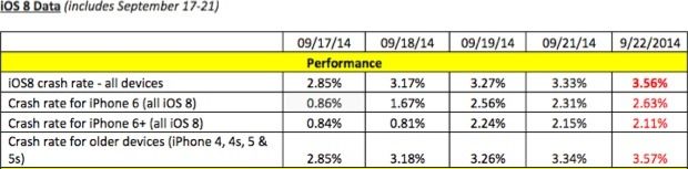 Το γεγονός πως το iOS 8 δεν είναι ακόμη τόσο σταθερό όπως το iOS 7 δεν πρέπει να προκαλεί έκπληξη αν αναλογιστεί κανείς πόσο περισσότερο χρόνο είχε το iOS 7 στην ανάπτυξη του. Κοιτώντας τους αριθμούς βλέπουμε πως οι παλαιότερες συσκευές είναι πιο ευπαθείς σε crashes, συσκευές όπως τα iPhone 4S, 5, 5S κλπ.