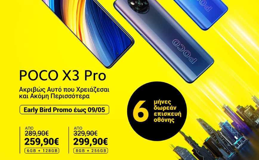 - POCO X3 Pro, σε Phantom Black ή Frost Blue, με μνήμη 8GB + 256GB, €329,90 και με early bird προσφορά στα €299,90έως τις 9/5/2021.