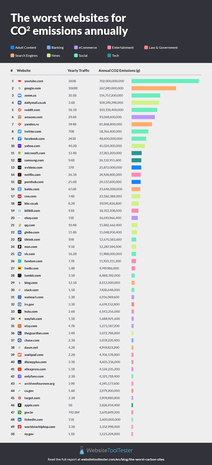 Το χειρότερο site σε εκπομπές διοξειδίου του άνθρακα σε ετήσια βάση με διαφορά από τα άλλα είναι το YouTube, το οποίο με 360 δισεκατομμύρια επισκέψεις το χρόνο, παράγει 702.000 τόνους CO2 ετησίως. Στη δεύτερη θέση βρίσκεται το Google.com με λιγότερο από τις μισές εκπομπές.