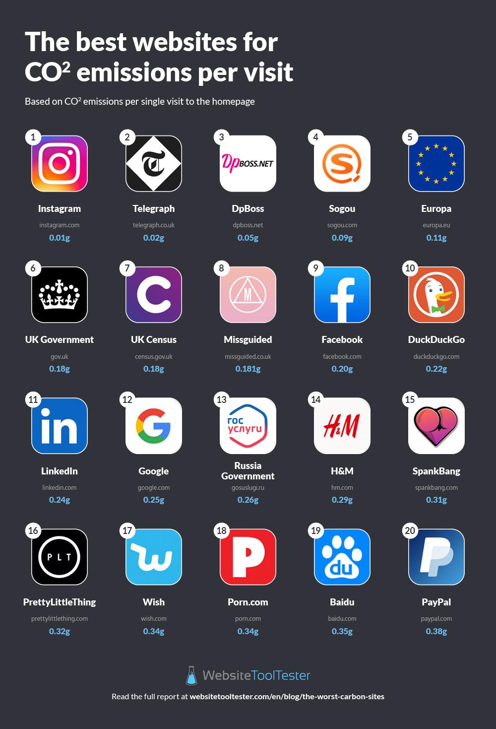 Στον αντίποδα όμως έχουμε το Instagram στην πρώτη θέση των sites με τις λιγότερες εκπομπές ρύπων, με 0.01 γραμμάρια ανά επίσκεψη, κυρίως λόγω του καθαρού σχεδιασμού του, ενώ την ίδια στιγμή το Facebook έχει 0.20 γραμμάρια και το Twitter 0.84 γραμμάρια.