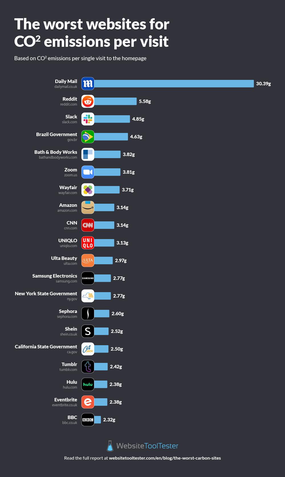 Εν τω μεταξύ, η Daily Mail παράγει τις περισσότερες εκπομπές CO2 ανά επίσκεψη με 30.39 γραμμάρια κάθε φορά που κάποιος επισκέπτεται τη σελίδα της. Και εδώ, η διαφορά με το δεύτερο Reddit είναι τεράστια, αφού παράγει μόλις 5.58 γραμμάρια.