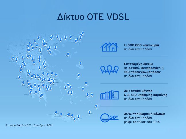 Με τις τελευταίες επεκτάσεις, συνολικά 367 αστικά κέντρα και 2.732 υπαίθριες καμπίνες του ΟΤΕ, προσφέρουν ταχύτητες VDSL σε όλη την Ελλάδα. Μέσω του σημαντικού επενδυτικού πλάνου του ομίλου, περισσότερα από 1.300.000 νοικοκυριά και επιχειρήσεις, έχουν πρόσβαση στην τεχνολογία VDSL, ενώ στόχος είναι η πληθυσμιακή κάλυψη να φτάσει στο 30% έως το τέλος του 2014.