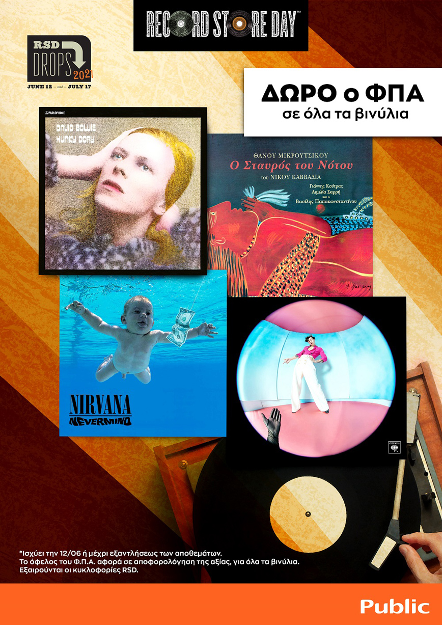 Επιπλέον μόνο για το Σάββατο 12 Ιουνίου, το Public κάνει δώρο το ΦΠΑ σε όλα τα βινύλια. Η προσφορά ισχύει στα καταστήματα Public και online στο Public.gr (εξαιρούνται όσα LP εμφανίζονται στο e-shop κατόπιν παραγγελίας καθώς και οι αποκλειστικές κυκλοφορίες για τη RSD).