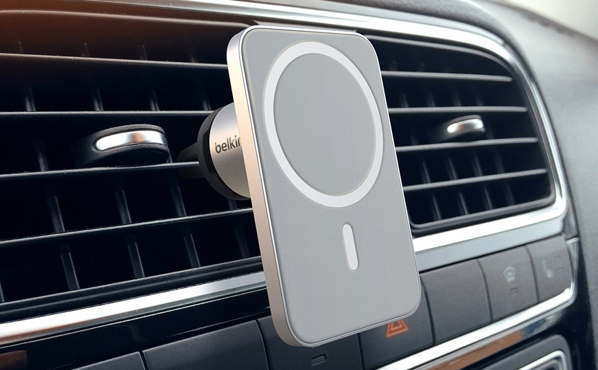 Το Belkin Car Vent Mount PRO (κοστίζει 40 δολάρια) είναι ένα premium σύστημα μαγνητικής βάσης στήριξης με MagSafe τεχνολογία. Διαθέτει και σύστημα άρθρωσης με μπίλια, γεγονός που επιτρέπει στο iPhone να προσαρμόζεται είτε σε οριζόντια είτε σε κατακόρυφη διάταξη, βελτιώνοντας κατά πολύ την εργονομία.