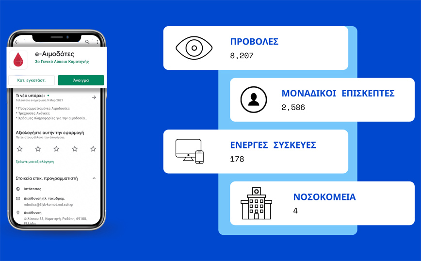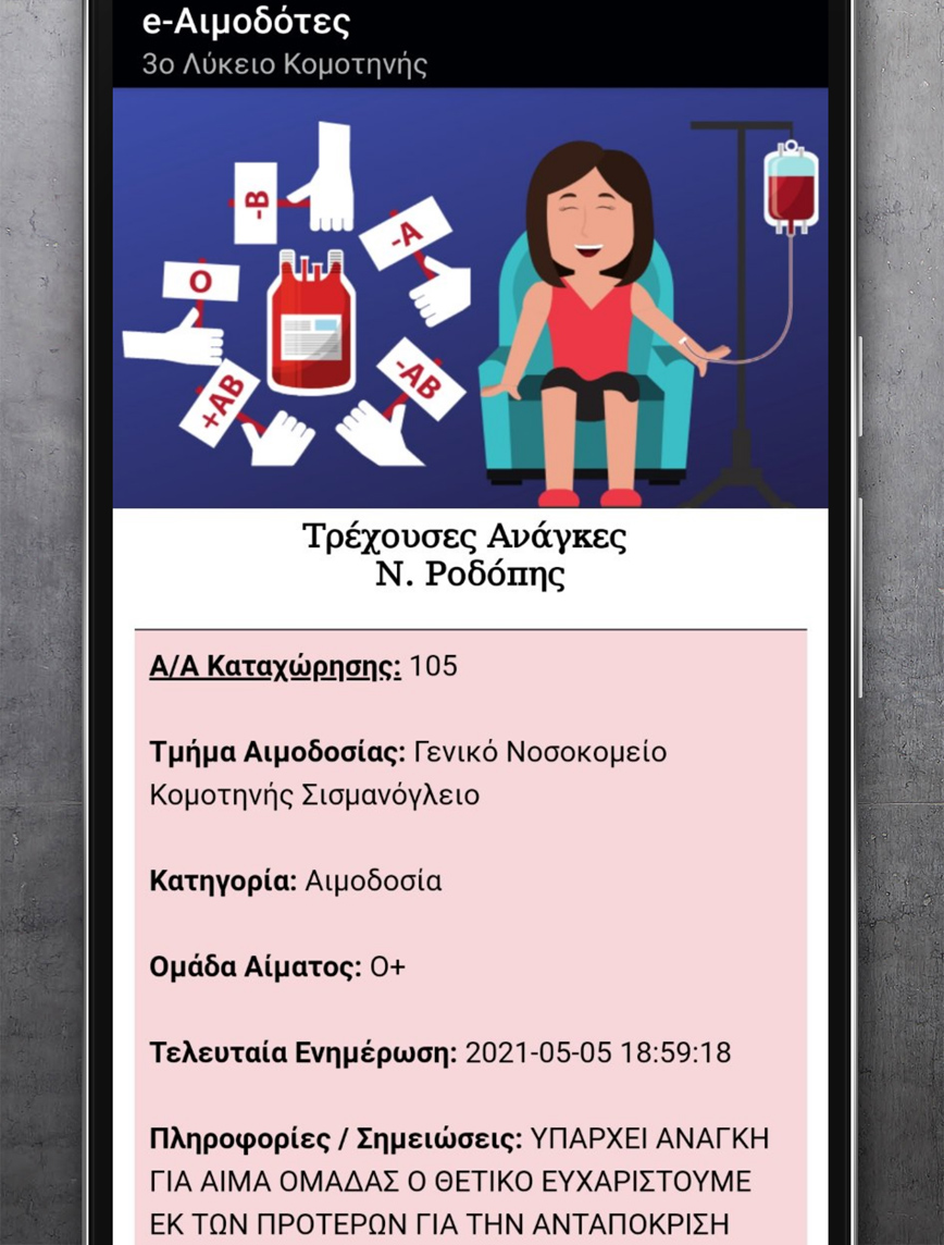 Τρεις μαθητές του 3ου Γενικού Λυκείου Κομοτηνής της Ομάδας Ρομποτικής και Προγραμματισμού, ο Άγγελος, ο Βασίλης και ο Λέανδρος ένωσαν τις δυνατότητές τους αλλά παράλληλα και τις γνώσεις τους στη βιολογία και στην πληροφορική δημιουργώντας ένα ολοκληρωμένο Πληροφοριακό Σύστημα, μια πρωτοποριακή πλατφόρμα αιμοδοσίας.