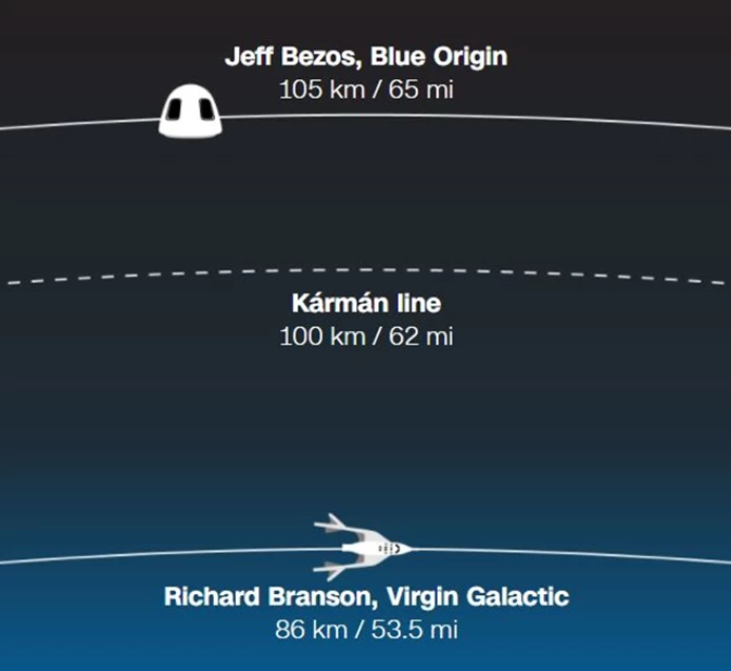 Βέβαια, όπως είπαν κατόπιν οι πάσης φύσεως αναλυτές, ο ιδρυτής της Amazon -και πλουσιότερος άνθρωπος του κόσμου- ήταν εκείνος που βγήκε κερδισμένος από αυτή την πρώτη διαστημική «κόντρα», αφού ταξίδεψε μεν λιγότερη ώρα, αλλά σε μεγαλύτερο ύψος, καθώς το σκάφος της Blue Origin έφτασε στα 105 χιλιόμετρα στο απόγειο της πτήσης του (5 χλμ. πάνω από την Γραμμή Καρμάν, το «όριο του διαστήματος»), έναντι 86 χιλιομέτρων της Virgin Galactic.