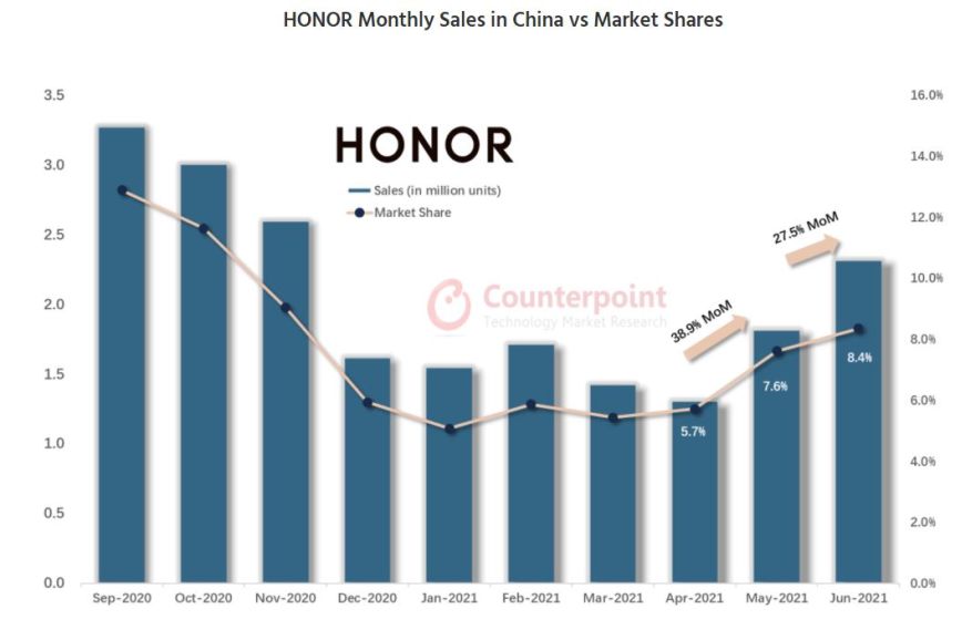 Σύμφωνα με τα μηνιαία στοιχεία της Counterpoint Market Pulse το μερίδιο αγοράς της HONOR στην Κίνα διαμορφώθηκε στο 8,4% τον Ιούνιο από 5,1% τον Ιανουάριο 2021, ενώ είναι ήδη πολύ κοντά στο ανώτατο όριο πωλήσεων των 4,55 εκατομμυρίων συσκευών που σημείωσε τον Αύγουστο του 2020.