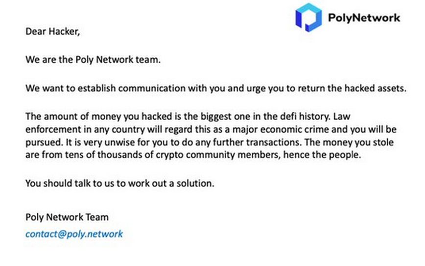 Σε ανοιχτή επιστολή της προς τους δράστες η Poly Network επισημαίνει: «Το ποσό που κλέψατε είναι ένα από τα μεγαλύτερα στην ιστορία της Defi (Decentralized finance). Οι αρχές σε οποιαδήποτε χώρα θα το θεωρήσουν μεγάλο οικονομικό έγκλημα και θα ασκηθεί εναντίον σας δίωξη. Τα χρήματα που κλέψατε είναι από δεκάδες χιλιάδες μέλη της κοινότητας των κρυπτονομισμάτων, δηλαδή από απλούς πολίτες».