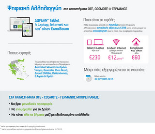 Δωρεάν tablet ή laptop, ίντερνετ και εκπαίδευση στη χρήση τεχνολογιών πληροφορικής και εκπαίδευσης έχουν τη δυνατότητα να αποκτήσουν οι κάτοχοι του Κοινωνικού Μερίσματος 2014 στα καταστήματα ΟΤΕ-COSMOTE-ΓΕΡΜΑΝΟΣ, μέσα από τη Δράση «Ψηφιακές Υπηρεσίες Αλληλεγγύης στις 8 Περιφέρειες Αμιγούς Σύγκλισης» .