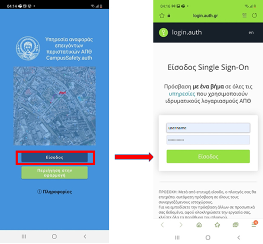 Για την πρόσβαση στην υπηρεσία αναφοράς επειγόντων περιστατικών, η εφαρμογή έξυπνων κινητών συσκευών απαιτεί την πιστοποίηση του χρήστη μέσω του ιδρυματικού του λογαριασμού, σύμφωνα με το Αθηναϊκό Πρακτορείο Ειδήσεων. Η χρήση της υπηρεσίας είναι προαιρετική, ενώ το Πανεπιστήμιο συλλέγει μόνο τα δεδομένα που είναι απολύτως απαραίτητα για την εξυπηρέτηση του σκοπού της υπηρεσίας.