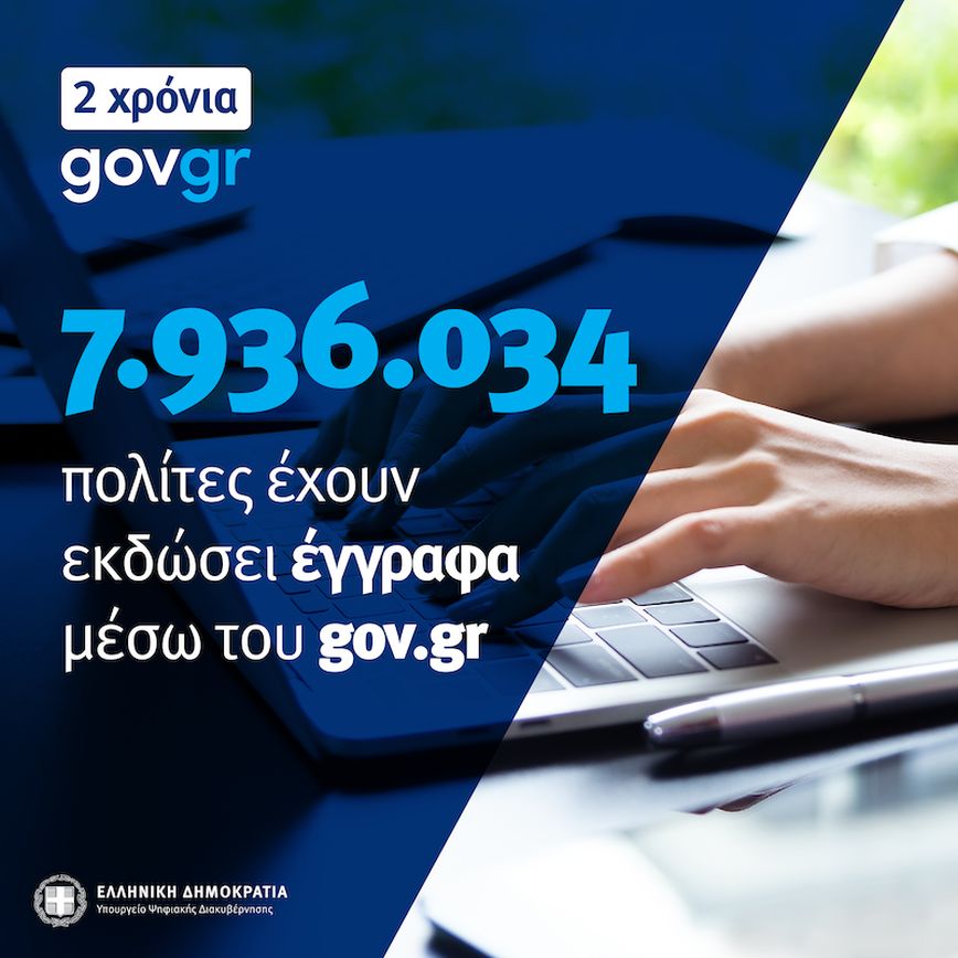 - 7.936.034 διαφορετικοί πολίτες έχουν χρησιμοποιήσει το gov.gr, εκδίδοντας ένα τουλάχιστον έγγραφο ή υποβάλλοντας μια ηλεκτρονική δήλωση.