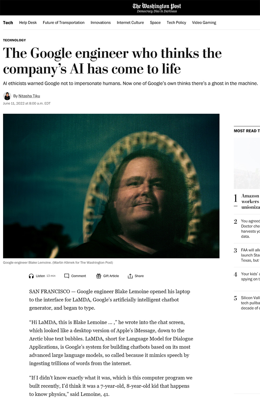Σε αναγκαστική άδεια μετ’ αποδοχών έβγαλε η Google τον επί επτά χρόνια μηχανικό της Μπλέικ Λεμόιν, που υποστήριξε ότι ένα από τα συστήματα τεχνητής νοημοσύνης της εταιρείας, το LaMDA (Language Model for Dialogue Applications), έχει αποκτήσει συνείδηση και αισθήματα και ζητά να έχει δικαιώματα και οι επιθυμίες του να γίνονται σεβαστές.