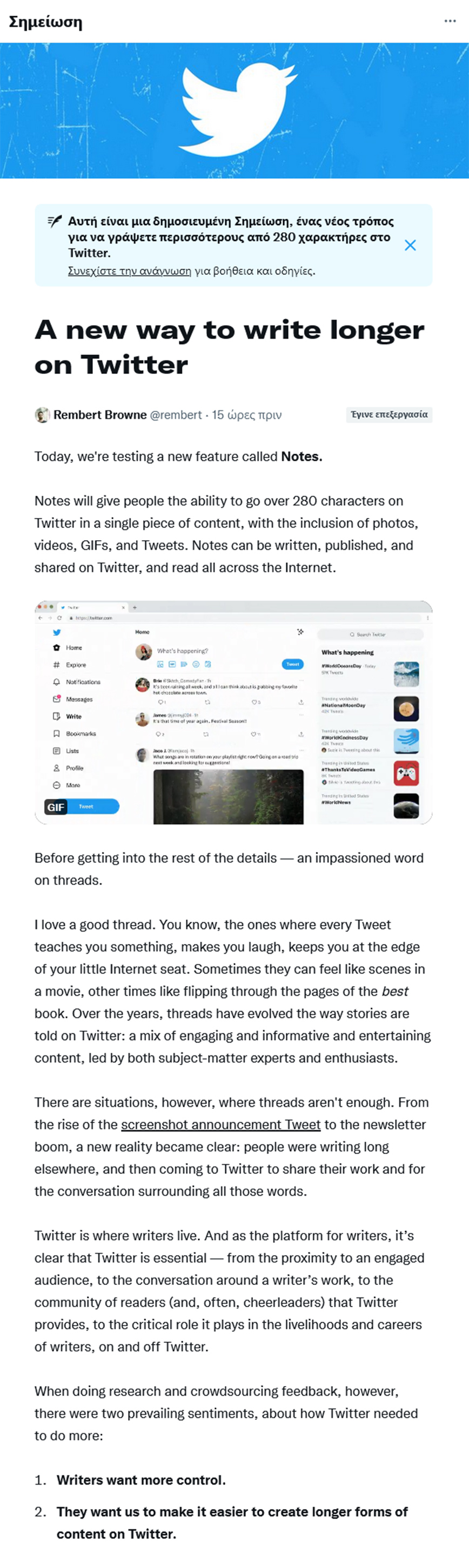Notes λέγεται το νέο εργαλείο που ξεκίνησε να δοκιμάζει το Twitter και θα επιτρέπει στους χρήστες να μοιράζονται μεγάλα κείμενα μεγέθους έως 2.500 λέξεων.