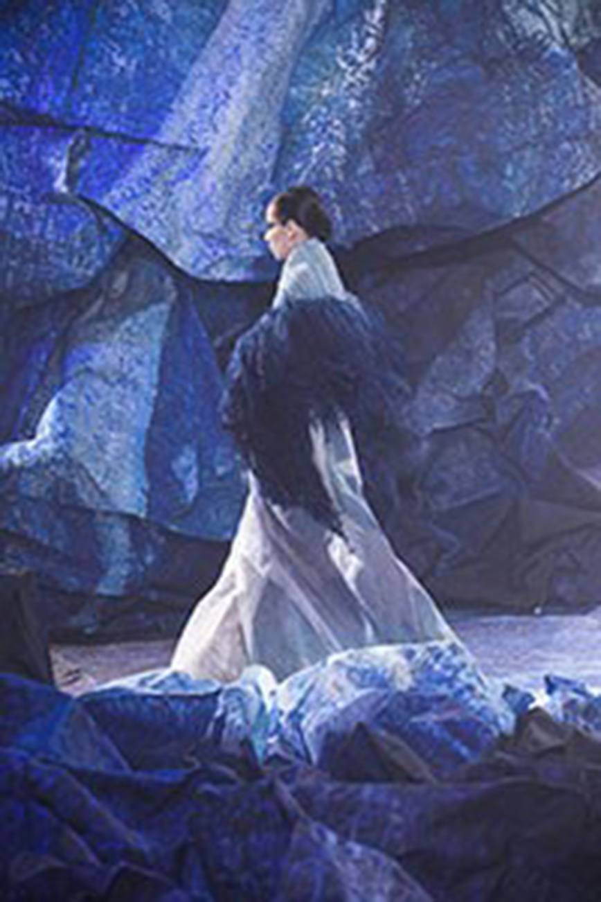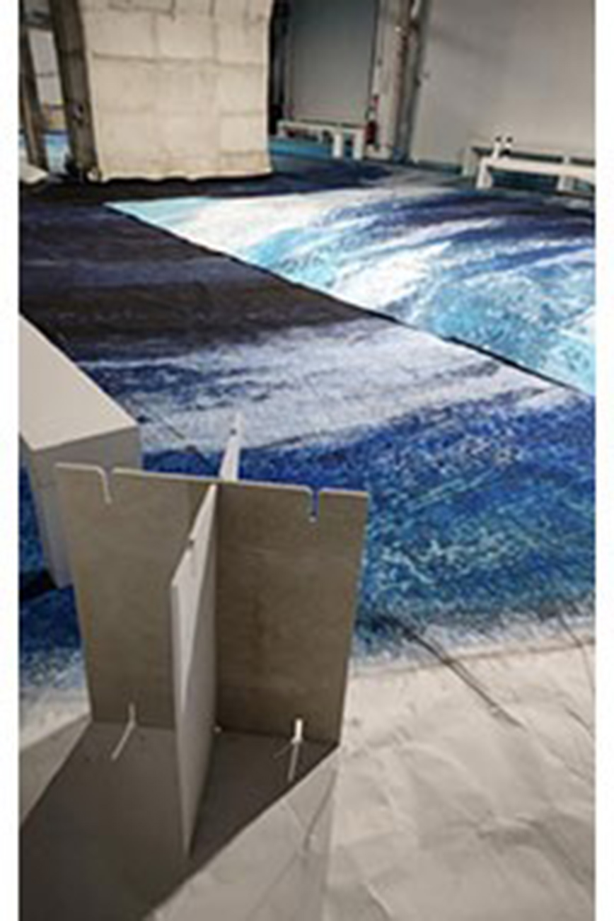 Εκτός από την υποστήριξη της παραγωγής ρούχων, η Epson υποστήριξε επίσης τη σκηνογραφία χρησιμοποιώντας την τεχνολογία της ψηφιακής εκτύπωσης στην παραγωγή χάρτινων γλυπτών. Αυτά τα γλυπτά ήταν σημαντικά στοιχεία που βοήθησαν στη δημιουργία του οράματος της συλλογής με θέμα το μπλε. Ολόκληρη η σκηνή ήταν περιτυλιγμένη από εικόνες της Γης που ζωγράφισε στο χέρι ο Yuima Nakazato. Αυτές οι εικόνες μεγεθύνθηκαν και εκτυπώθηκαν σε ένα σύνολο 832 τετραγωνικών μέτρων χαρτιού εκτύπωσης, χρησιμοποιώντας έναν εκτυπωτή inkjet SC-P20050 στο Κέντρο Λύσεων LFP στο γραφείο Hirooka της Epson.