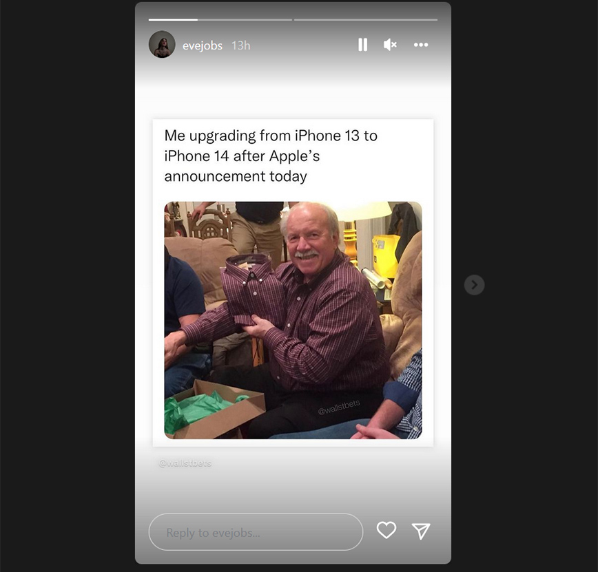 Ουσιαστικά αυτό που λέει είναι ότι εκείνοι που αναβάθμισαν το iPhone 13 σε iPhone 14 δεν έκαναν τίποτα διαφορετικό. «Eγώ όταν αναβαθμίζω το iPhone 13 σε iPhone 14 μετά την ανακοίνωση της Apple», έγραψε η Ιβ Τζομπς.
