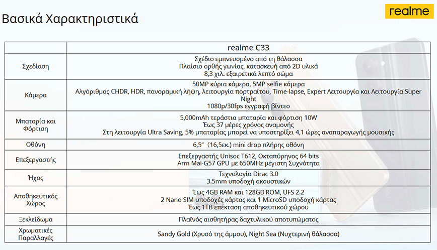 Παράλληλα, το realme C33 διαθέτει επίσης τη λειτουργία Ultra Saving, με το χρόνο αναμονής να αυξάνεται στις 43,6 ώρες με μόλις 5% χρήση της μπαταρίας!