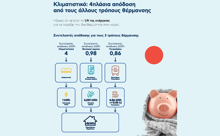 Επομένως, παρόλο που η τιμή του ρεύματος ανά kWh είναι υψηλότερη σε σχέση με του πετρελαίου και του φυσικού αερίου, το κλιματιστικό, τελικά, αποτελεί τον πιο οικονομικό τρόπο θέρμανσης.
