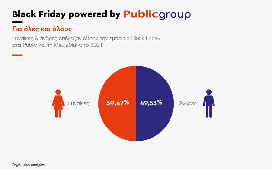 - Στην online Black Friday 2021, συμμετείχαν δυναμικά και τα δύο φύλα: Με ποσοστό 50,47% (Γυναίκες) και 49,53 (Άνδρες), τα δύο φύλα εκπροσωπήθηκαν εξίσου.