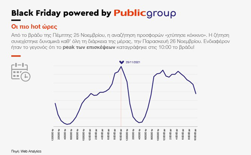 - Οι πιο hot ώρες: Από το βράδυ της Πέμπτης 25 Νοεμβρίου, η αναζήτηση προσφορών «χτύπησε κόκκινο». Η ζήτηση συνεχίστηκε δυναμικά καθ’ όλη τη διάρκεια της Black Friday 26 Νοεμβρίου. To peak των αναζητήσεων σημειώθηκε την περίοδο αναμονής, την Πέμπτη 25 Νοεμβρίου 2021, στις 10μμ!