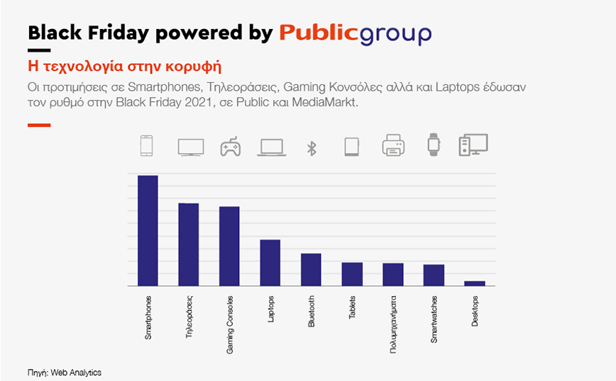 Τα στοιχεία, που είναι διαθέσιμα στο blog του Public εδώ, αφορούν αμιγώς ηλεκτρονικές αναζητήσεις και αγορές που πραγματοποιήθηκαν στο public.gr και το mediamarkt.gr κατά την περσινή Black Friday (Παρασκευή 26 Νοεμβρίου 2021) και αναδεικνύουν σημαντικές τάσεις για την αγορά.