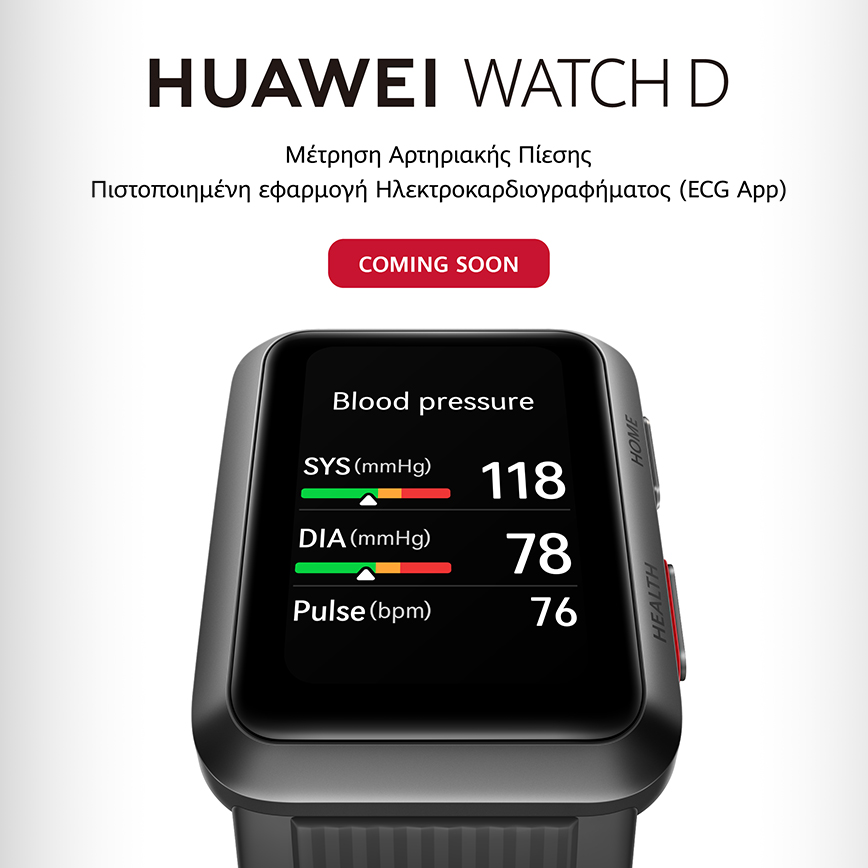 Το πραγματικό smartwatch πιεσόμετρο HUAWEI WATCH D, για παρακολούθηση αρτηριακής πίεσης, αλλά και ηλεκτροκαρδιογραφήματος (ECG), με πιστοποίηση από την Ευρωπαϊκή Ένωση, έρχεται και στην Ελλάδα από την Huawei. Με το HUAWEI WATCH D, οι χρήστες μπορούν με ευκολία να παρακολουθούν την υγεία τους, κοιτώντας απλώς τον καρπό τους. Το νέο αυτό smartwatch δίνει τη δυνατότητα παρακολούθησης της αρτηριακής πίεσης, οπουδήποτε σε πραγματικό χρόνο. Το HUAWEI WATCH D είναι ο νέος καθημερινός σύντροφος για τη φροντίδα της υγείας.