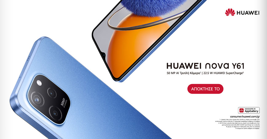 Το νέο κομψό smartphone HUAWEI nova Y61 διαθέτει τριπλή κάμερα AI 50MP τελευταίας τεχνολογίας, εξαιρετικό design, «ακούραστη» μπαταρία με μεγάλη διάρκεια ζωής και γρήγορη φόρτιση, προσφέροντας μία ευχάριστη εμπειρία χρήσης. Το smartphone, που συνδυάζει την τεχνολογία με την κομψότητα, επιτρέπει τη λήψη φωτογραφιών υψηλής ανάλυσης, με κρυστάλλινες λεπτομέρειες και ιδανική φωτεινότητα, ενώ το Super Night Shot επιτρέπει την αποτύπωση πανέμορφων νυχτερινών τοπίων, χωρίς τη χρήση τρίποδου. Ο δεύτερος πίσω φακός είναι η κάμερα βάθους 2MP που συνεργάζεται με την κύρια κάμερα 50MP για φωτογραφίες υψηλής φωτεινότητας με πλήρη ευκρίνεια, ενώ ο τρίτος φακός είναι η κάμερα Macro 4cm, η οποία επιτρέπει στους χρήστες να εξερευνήσουν έναν πιο μικροσκοπικό κόσμο πέρα από αυτό που μπορούν να δουν. Παράλληλα, μέσω του AppGallery μπορούμε να βρούμε όλες τις δημοφιλείς εφαρμογές, όπως WhatsApp, Viber, Instagram, Facebook Messenger, TikTok, αλλά και πολλαπλές εφαρμογές που έχουν αναπτυχθεί σε τοπικό επίπεδο, όπως μεταξύ άλλων, υπηρεσίες τραπεζών (Εθνική Τράπεζα, Τράπεζα Πειραιώς, Alpha Bank, Eurobank), παραγγελία φαγητού (e-Food, BOX), εύρεσης ταξί (Taxiplon), πάροχοι κινητής τηλεφωνίας (Cosmote, Vodafone, Wind) και λειτουργίες με σύστημα πληρωμών, όπως το ”My Alpha Wallet”. Στο κομμάτι των πληρωμών, το AppGallery διαθέτει διεθνή εφαρμογές NFC πληρωμών και mobile banking, όπως την Curve και Revolut. Αναφορικά με τις υπηρεσίες της Google, μέσα από το κατάστημα AppGallery, ο χρήστης μπορεί να κατεβάσει την 3rd party εφαρμογή Gspace και μέσα από εκεί έχει όλες τις εφαρμογές που χρειάζεται στο κινητό του. Η εφαρμογή Gspace δεν έχει διαφημίσεις και μπορεί κανείς να χρησιμοποιήσει εφαρμογές και υπηρεσίες της Google, όπως το YouTube, Gmail, Google Maps, Google Docs, Google Sheets και Google Drive. Το HUAWEI nova Y61 διατίθεται στην Ελληνική αγορά μέσα από το δίκτυο καταστημάτων ΓΕΡΜΑΝΟΣ.