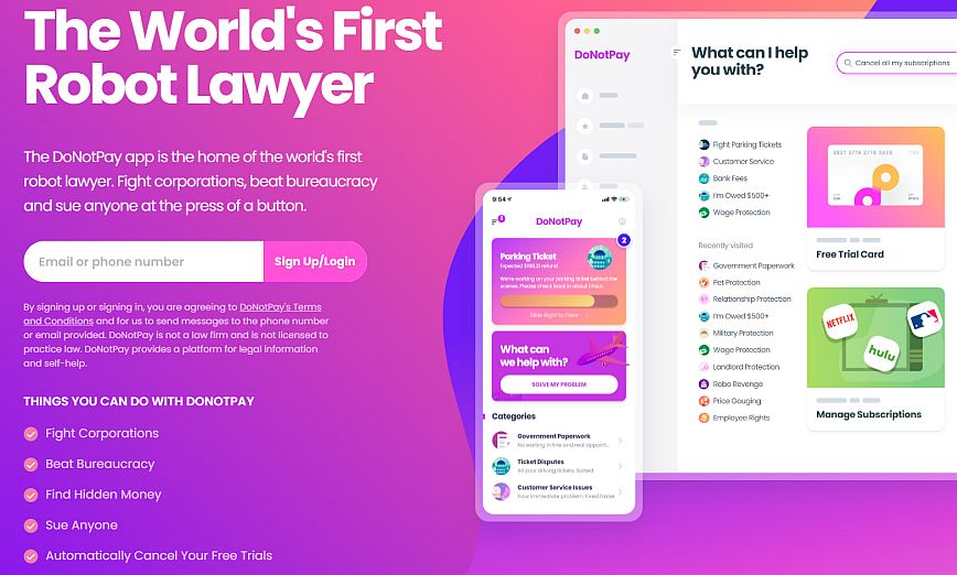 Η νεοσύστατη εταιρία παροχής νομικών υπηρεσιών DoNotPay ισχυρίζεται ότι μ’ αυτόν τον τρόπο θα μπορεί ο καθένας να μηνύσει όποιον επιθυμεί και να νικήσει την γραφειοκρατία.