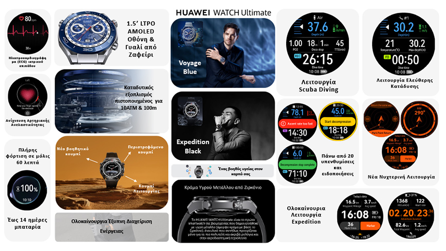 Η έκδοση του HUAWEI WATCH Ultimate Expedition Black δημιουργήθηκε για θαρραλέες ψυχές που αγαπούν την ύπαιθρο και θέλουν με κάθε ευκαιρία να δραπετεύουν από την «άνεση» της πόλης. Παράλληλα, το HUAWEI WATCH Ultimate Voyage Blue ενσαρκώνει τη δύναμη της άγριας θάλασσας. Με κεραμική στεφάνη νανοτεχνολογίας σε βαθύ μπλε, να θυμίζει την απεραντοσύνη του ωκεανού, αυτή η έκδοση δεν είναι απλά ένα εξαιρετικό smartwatch υψηλών προδιαγραφών, αλλά και ένα fashion statement για όσους αγαπούν τα θαλάσσια σπορ.