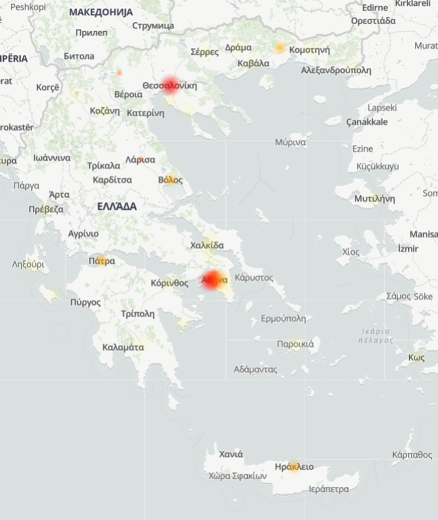 Σύμφωνα με το Down detector, τα μεγαλύτερα προβλήματα αντιμετωπίζουν οι χρήστες σε Αθήνα, Χαλκίδα, Θεσσαλονίκη, Πάτρα, Βόλο, Λάρισα, Κομοτηνή και Χανιά.