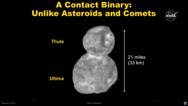 Οι νέες φωτογραφίες από απόσταση περίπου 27.000 χιλιομέτρων δείχνουν ότι η Έσχατη Θούλη (επισήμως γνωστή ως «2014 MU69») αποτελείται από δύο ανισομεγέθεις ακανόνιστες σφαίρες κολλημένες μεταξύ τους, δημιουργώντας ένα ενιαίο σώμα συνολικής διαμέτρου 33 χιλιομέτρων, δηλαδή, όσο το μέγεθος μιας πόλης.