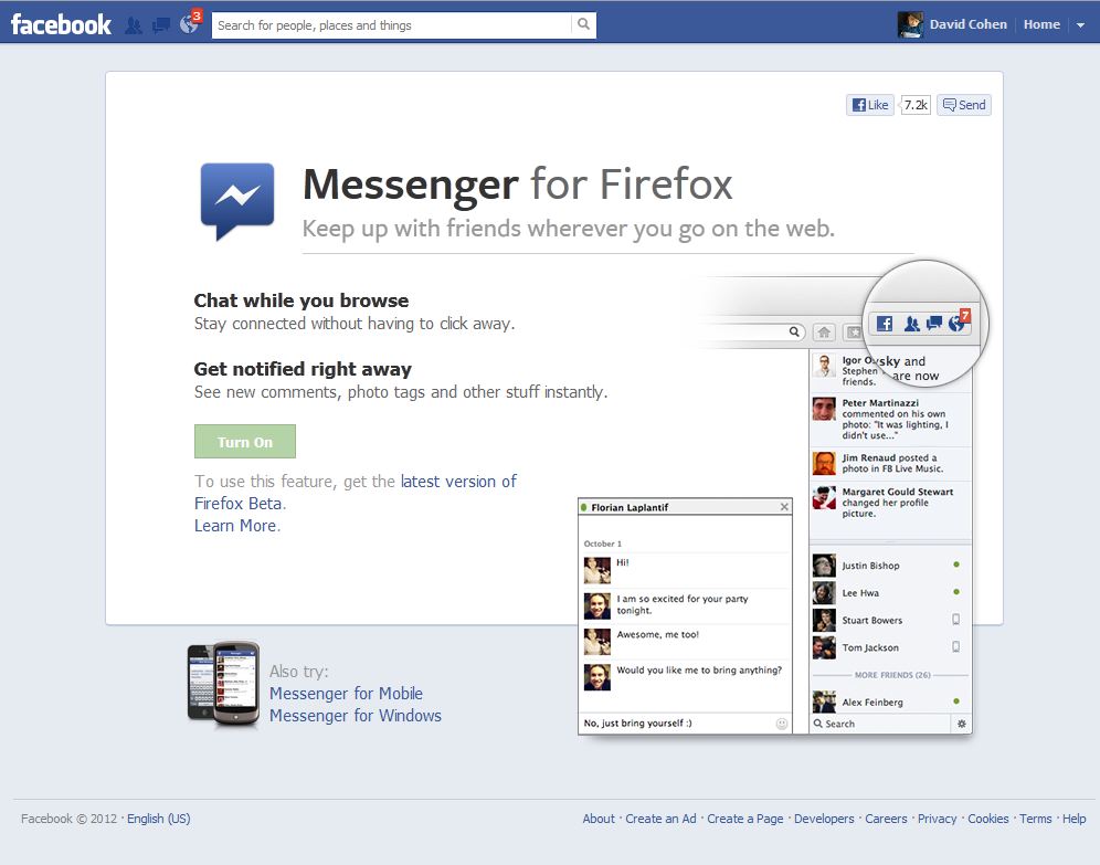 Για να ενεργοποιήσει κάνεις την νέα υπηρεσία θα πρέπει να «κατεβάσει» και να εγκαταστήσei την τελευταία έκδοση του γνωστου πλοηγού, Firefox 17, και μετά να επιλέξει την ρύθμιση «Turn On» στην διεύθυνση «Messenger for Firefox» του Facebook.
