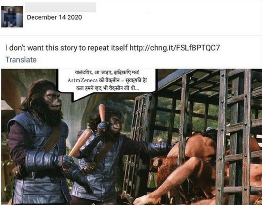 Οι αναρτήσεις από λογαριασμούς στο δίκτυο διέδωσαν μιμίδια που χρησιμοποίησαν εικόνες από τις ταινίες «Πλανήτης των Πιθήκων» για να δώσουν την εντύπωση ότι το εμβόλιο θα μετατρέψει τους ανθρώπους σε πιθήκους. Αυτές οι αναρτήσεις εμφανίστηκαν στο Facebook στα Χίντι περίπου την ίδια στιγμή που η ινδική κυβέρνηση συζητούσε την έγκριση έκτακτης ανάγκης για το εμβόλιο AstraZeneca.