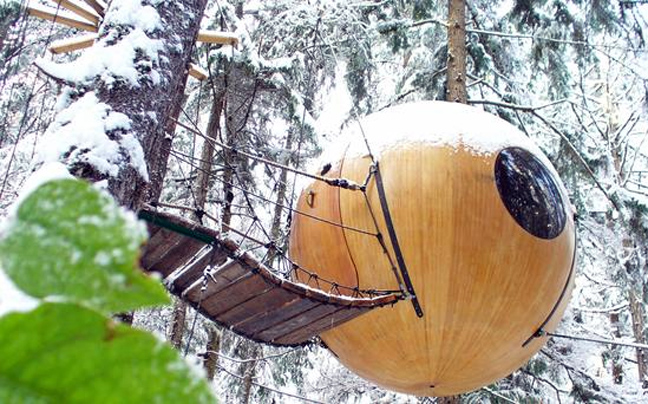 Σαν να κρέμονται από αόρατους ιστούς αράχνης, τα τεράστια –σαν χριστουγεννιάτικα στολίδια- στρογγυλά δεντρόσπιτα στολίζουν τα δάση της νήσου Βανκούβερ.