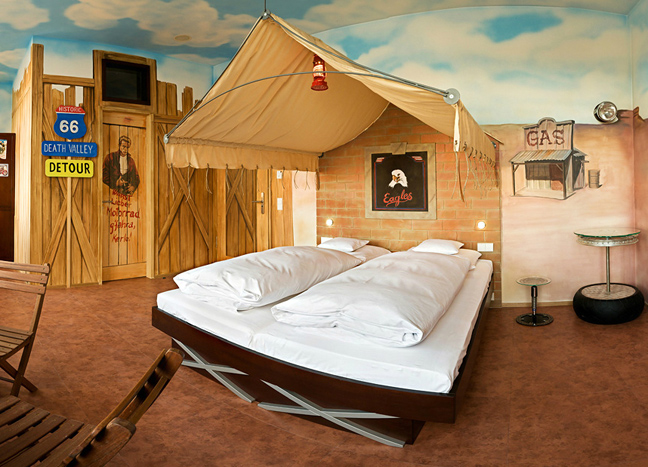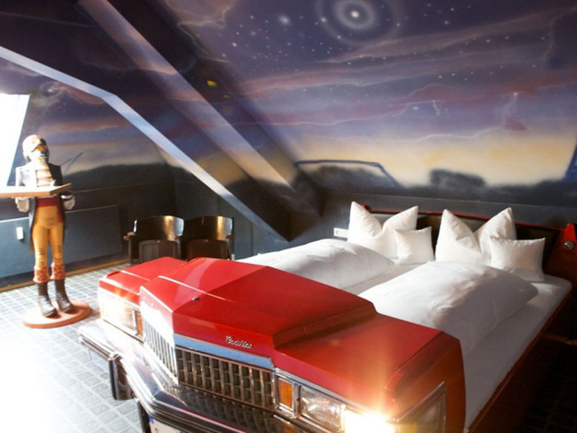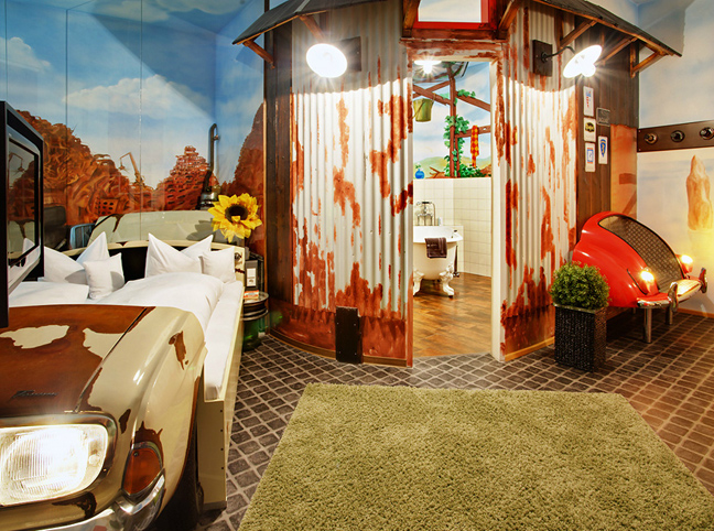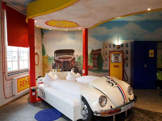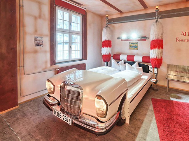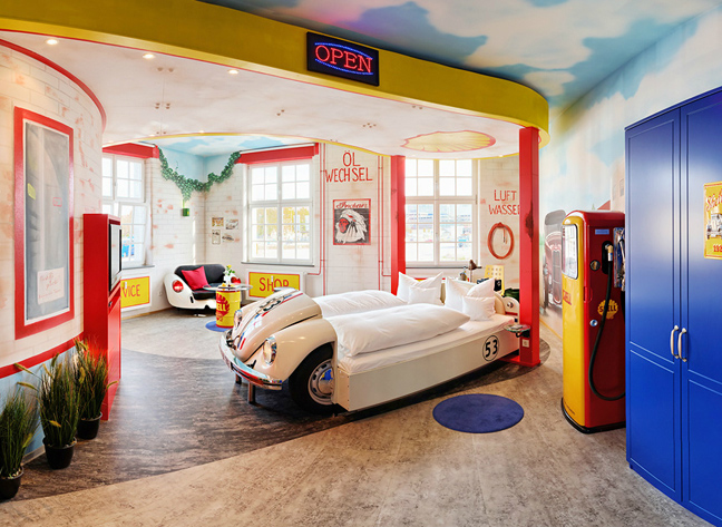 Τα θεματικά δωμάτιά και οι οικογενειακές σουίτες είναι εξοπλισμένα με υψηλής ποιότητας υλικά, κομψές λεπτομέρειες και πολλά γνήσια ανταλλακτικά από τον κόσμο της αυτοκινητοβιομηχανίας.