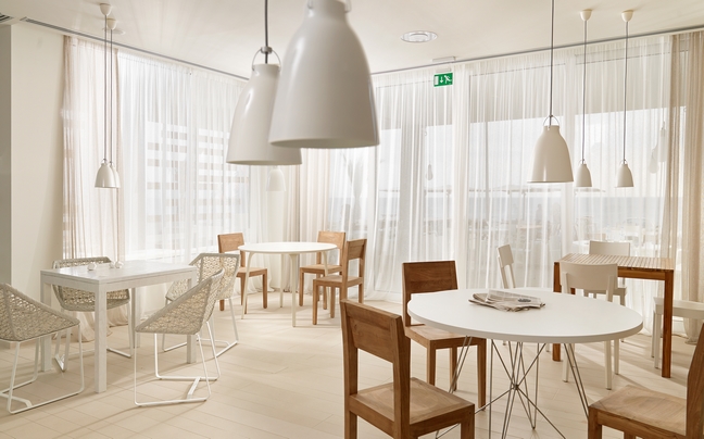 Μίνιμαλ γραμμές, γήινες αποχρώσεις και design έπιπλα συνθέτουν μια χαλαρωτική ατμόσφαιρα στο lobby και το εστιατόριο του Sesa.