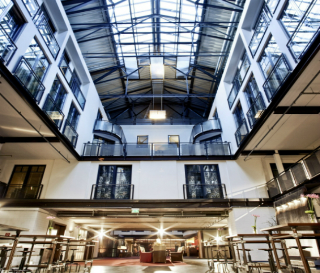 Το φυσικό φως, από τα δυο τεράστια τοξωτά παράθυρα και την γυάλινη οροφή υποδέχεται τους επισκέπτες στο φωτεινό αίθριο του λόμπι, ενώ ένα πράσινο βιομηχανικό μηχάνημα και ένας παλιός πύργος ρολογιού δίνουν το στίγμα του παρελθόντος του κτηρίου.