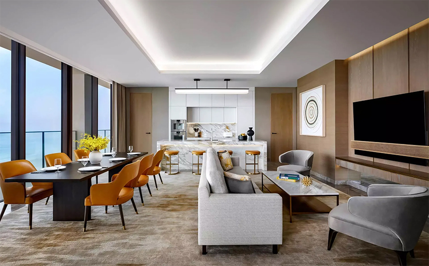 Η ιδιωτική κουζίνα σημαίνει ότι οι σεφ από τα διάσημα εστιατόρια του θέρετρου μπορούν να ετοιμάζουν ειδικά μενού για τους επισκέπτες, οι οποίοι μπορούν να τα απολαύσουν στην ιδιωτικότητα της σουίτας τους.