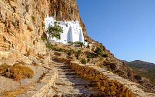 Χτισμένη ανάμεσα στα βράχια, η Μονή της Παναγίας της Χοζοβιώτισσας, στην Αμοργό, είναι ορατή μόνο από το πέλαγος. Σαν λευκή ζωγραφιά, πάνω σε βράχους απειλητικούς κι απόκρημνους, με το Αιγαίο να απλώνεται γενναιόδωρα 300 μέτρα πιο κάτω. Το λευκό της χρώμα, που αντανακλά εκτυφλωτικά τον ήλιο, δεν υπήρχε βέβαια εξαρχής.