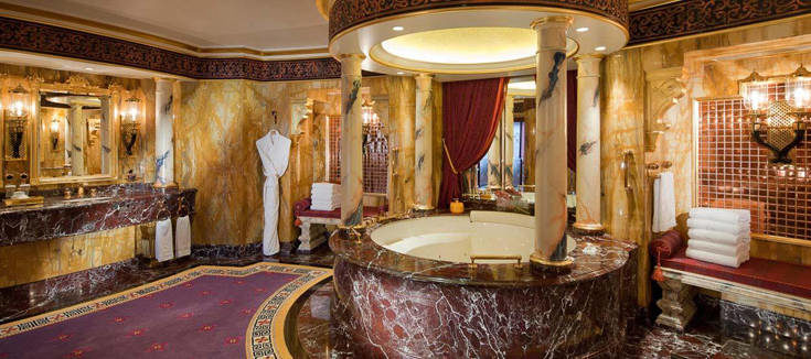 Το μεγαλύτερο από τα τρία μπάνια της σουίτας απλώνεται σε 350 τ.μ., είναι δημιουργημένο από μάρμαρο με χρυσά τελειώματα και διαθέτει μια μεγάλη ολοστρόγγυλη μπανιέρα με πληθώρα θέσεων για τους επισκέπτες της. Τα προϊόντα περιποίησης και τα αρώματα Hermes που βρίσκονται στο μπάνιο διατίθενται σε κανονικό μέγεθος.