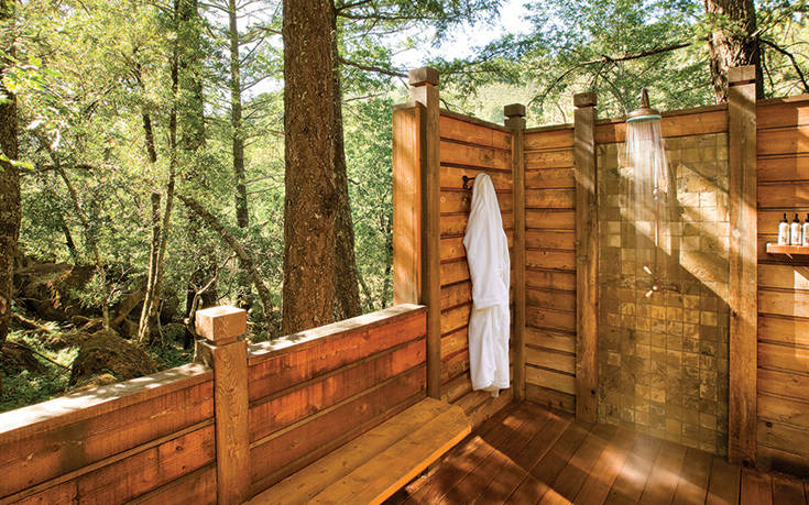 Σε ένα ξύλινο κατάστρωμα κάτω από τα θεόρατα δέντρα του δάσους στην Κοιλάδα, όποιος επιλέξει το Calistoga Ranch απολαμβάνει ένα αναζωογονητικό ντους μέσα στην αγκαλιά της φύσης. Στα συν το δεντρολίβανο, η λεβάντα και ο ευκάλυπτος κρεμασμένα ολόγυρα της ντουζιέρας, που λειτουργούν εν είδει φυσικής αρωματοθεραπείας.