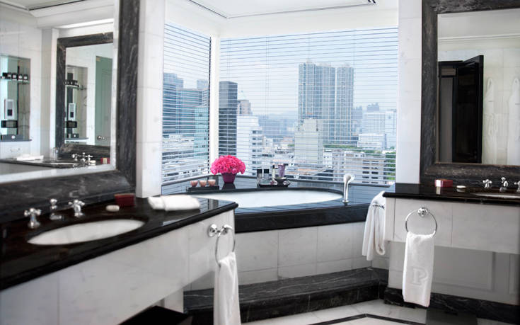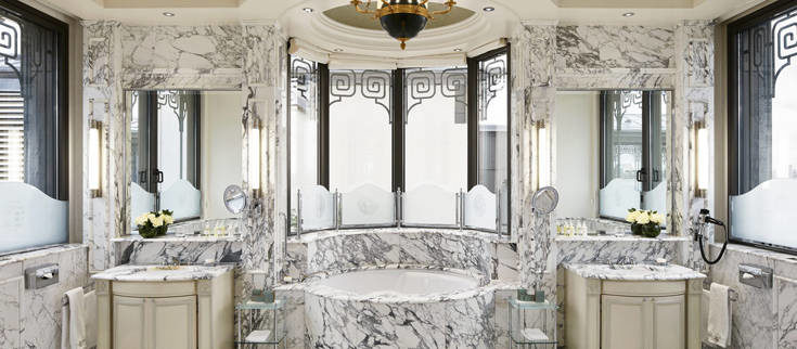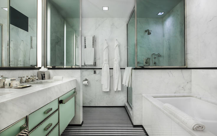 Το master λουτρό αποτελείται από λευκά πολυτελή μάρμαρα, διαθέτει θερμαινόμενα δάπεδα, τηλεόραση επίπεδης οθόνης καθώς και θερμαινόμενα ράφια για τις πετσέτες. Στα συν η μεγάλη μπανιέρα με το γυάλινο περίβλημα, καθώς και τα προϊόντα περιποίησης από τον πολυτελή γαλλικό οίκο Hermes –αποκλειστικά δημιουργημένα για το ξενοδοχείο.