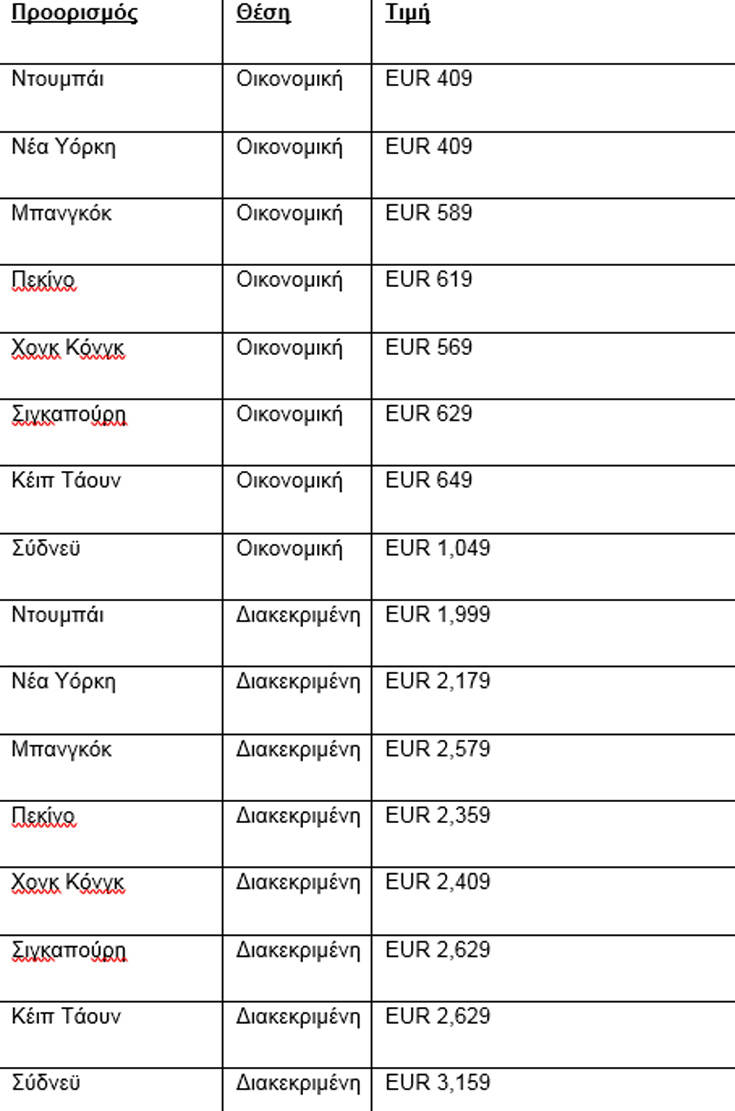 Οι ειδικές προσφορές της Emirates περιλαμβάνουν τους παρακάτω ενδεικτικούς προορισμούς: