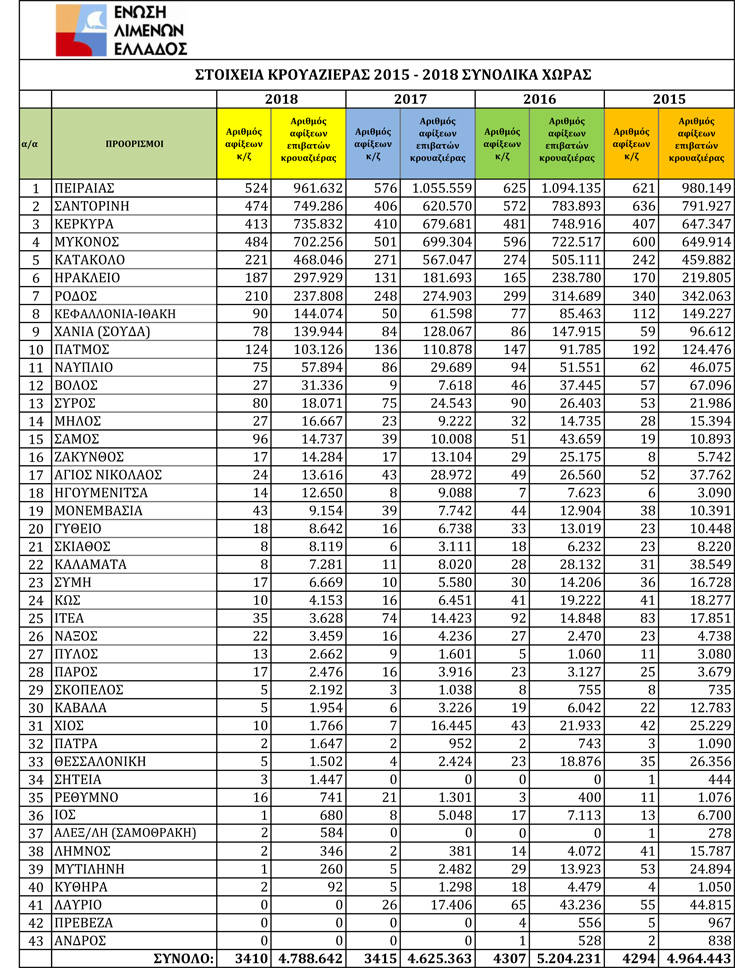 Σύμφωνα με στοιχεία που έδωσε στη δημοσιότητα η Ένωση Λιμένων Ελλάδας (ΕΛΙΜΕ), το 2018 καταγράφηκαν στο σύνολο των προορισμών κρουαζιέρας της Χώρας μας, 3.410 αφίξεις κρουαζιερόπλοιων έναντι 3.415 το 2017 και 4.307 το 2016 και 4.788.642 επισκέψεις επιβατών κρουαζιέρας έναντι 4.625.363 το 2017 και 5.204.431 το 2016.