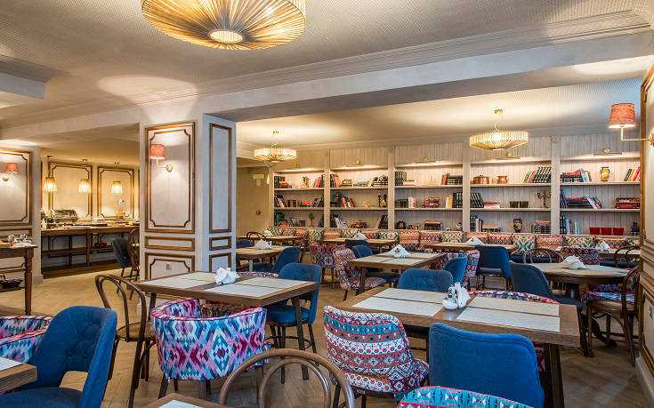 O ανακαινισμένος χώρος πρωινού διακρίνεται από την μοντέρνα, cozy και mountaint style διακόσμηση, με την τεράστια βιβλιοθήκη (αλλά και τον ενημερωμένο μπουφέ) να πρωταγωνιστούν, και σίγουρα θα σας κερδίσει. Όσον αφορά το μπουφέ θα απολαύσετε american style πρωινό, που ωστόσο τιμά τα τοπικά προϊόντα. Αν φανείτε τυχεροί θα δοκιμάσετε και κάποια από τα σπιτικά γλυκά, φτιαγμένα με μεράκι από τους ιδιοκτήτες.