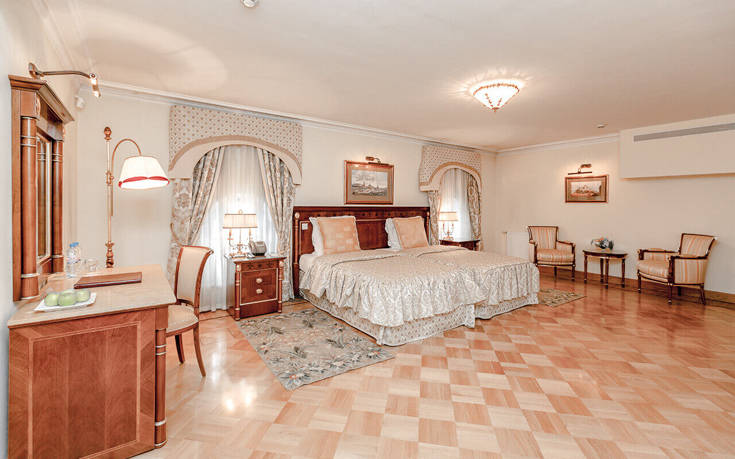 Μασίφ ξύλο, ζεστά χρώματα, χρυσά διακοσμητικά στοιχεία, πλούσια και «βαριά» υφάσματα, εντυπωσιακοί πολυέλαιοι και προσεκτικά επιλεγμένα χαλιά, καθιστούν τα 43 συνολικά δωμάτια και σουίτες του πραγματικά βασιλικά.